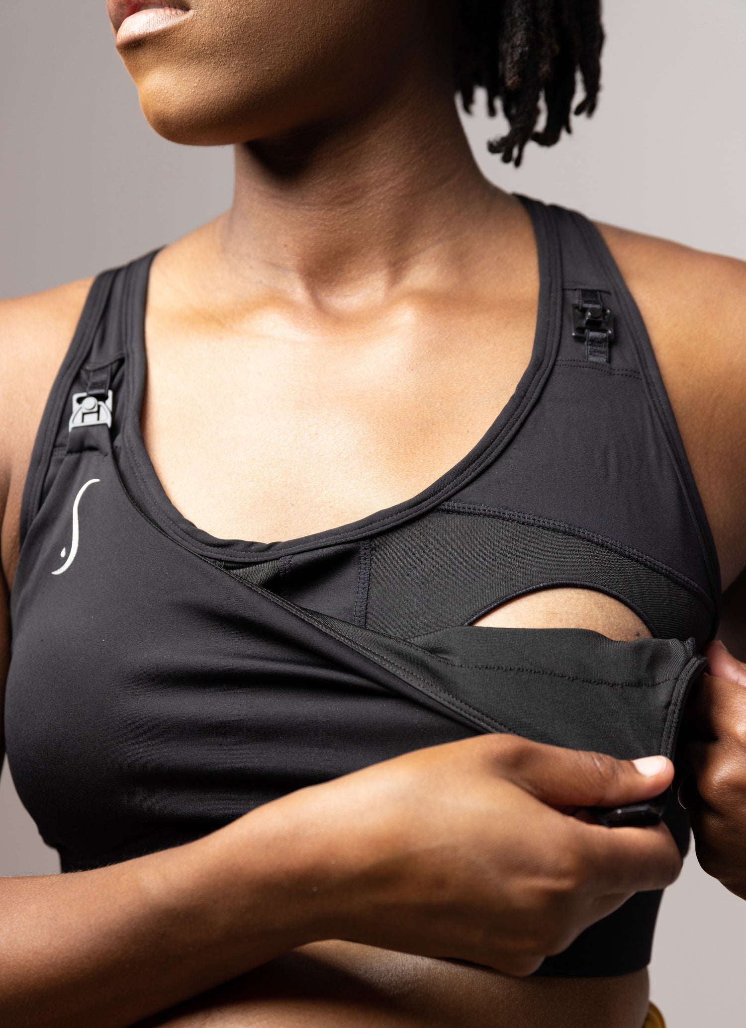Breathable, moisture wicking sports bra with adjustable straps and easy access nursing clips. Quick drying. Removable cups, and underwire free for comfort.